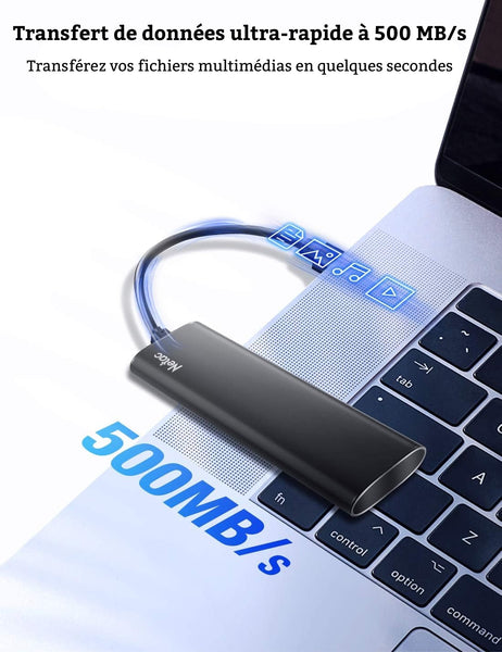 Grâce à son port USB-C 3.2 Gen 2, ce disque offre une vitesse de transfert allant jusqu’à 10 Gbps (jusqu'à 550 Mo/s en lecture et 500 Mo/s en écriture), ce qui permet de transférer un fichier de 1 Go en moins d'une seconde. Que vous travailliez sur des vidéos 4K, des projets graphiques lourds, ou que vous fassiez simplement des sauvegardes régulières, vous gagnerez un temps précieux.